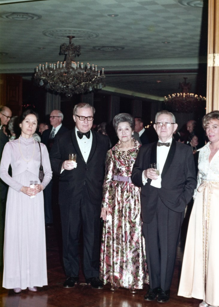 Brachman Family. October 31, 1971. Image shows the entire Brachman family at a celebration for Sol and Etta’s 50th Wedding anniversary at Shady Oaks Country Club in Fort Worth, Texas. Left to right: Marilyn, Sol Brachman, Etta Brachman, Malcolm Brachman (brother), and Minda Brachman (sister-in-law). MBH Foundation.