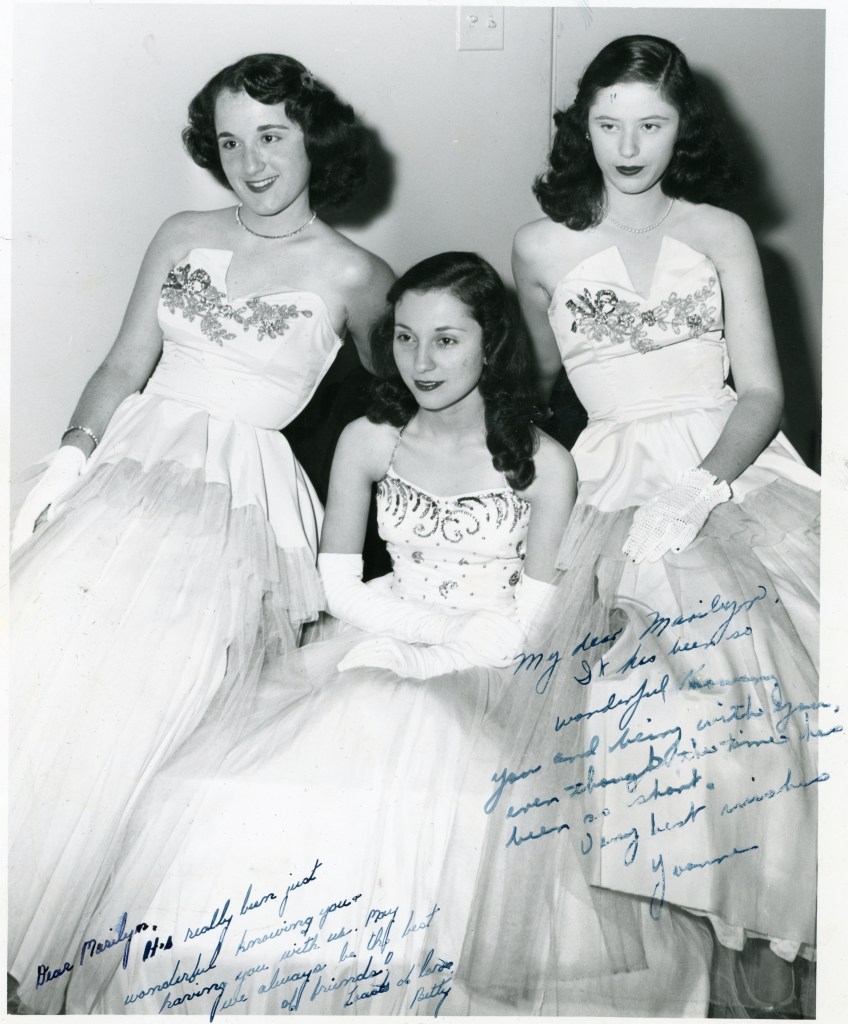 New Orleans, 1947. Marilyn Brachman (center) and two young women in formal gowns. Two personal notes on photo written to Marilyn. MBH Foundation1950s. Joking around. Left to right: Congressman Jim Wright, Tarrant County Sheriff Lon Evans, and Leon Brachman