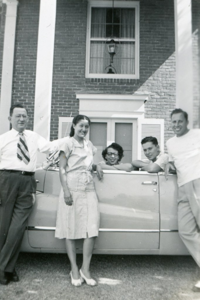 Sol and Etta Brachman, Rowena Ginsburg Kimmel, Malcolm Brachman, Sam Kimmel learning against a car, outside the Brachman home on Mockingbird Lane, ca. 1940s. MBH Foundation.1962. Left to Right. Unkown, Louis Barnett, Madilynn Barnett, Sayde Maye Garsek, Rabbi Isadore Garsek, Ella Brachman, Harry Beren, Louise Klar Lipshitz, Leo Lipshitz.